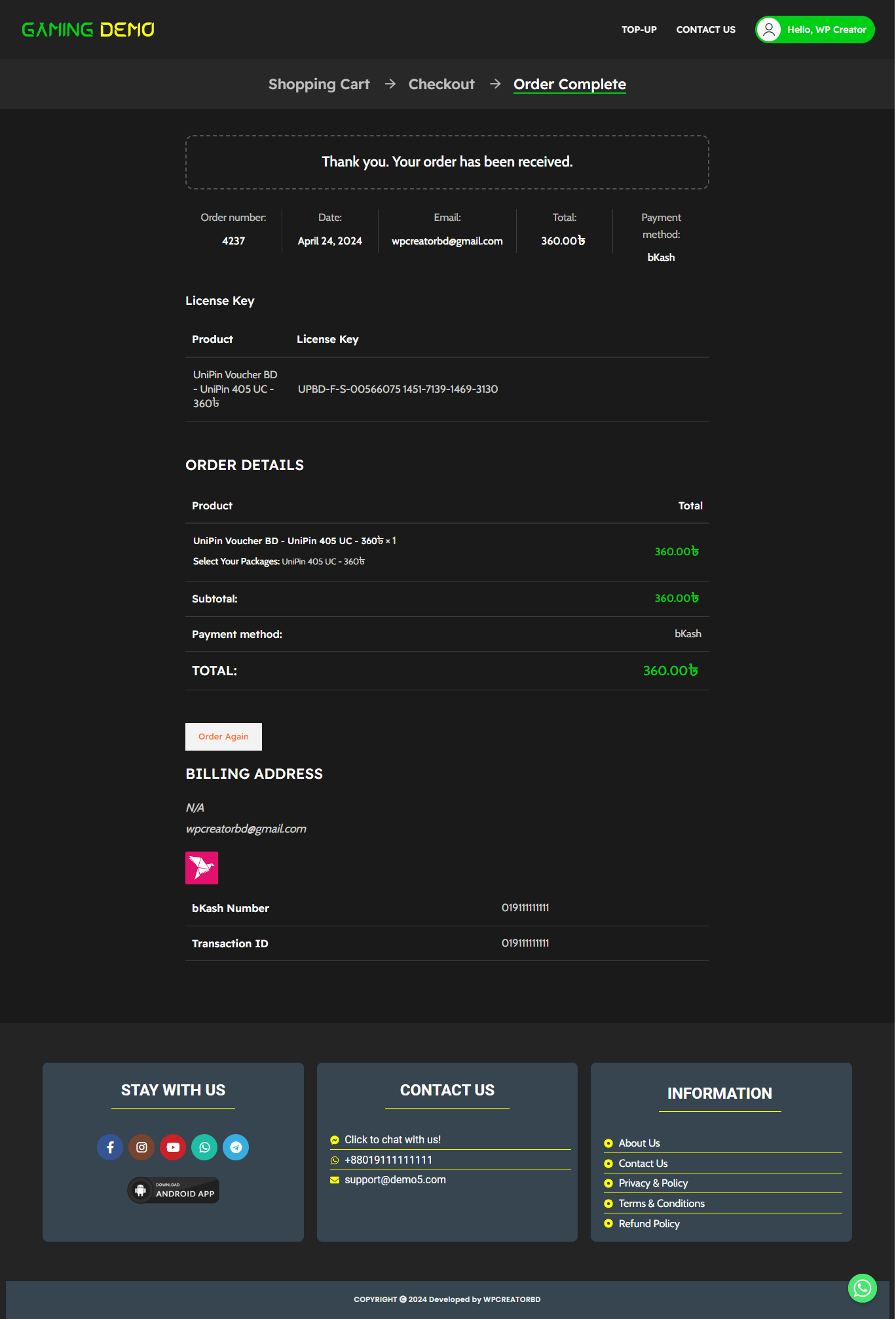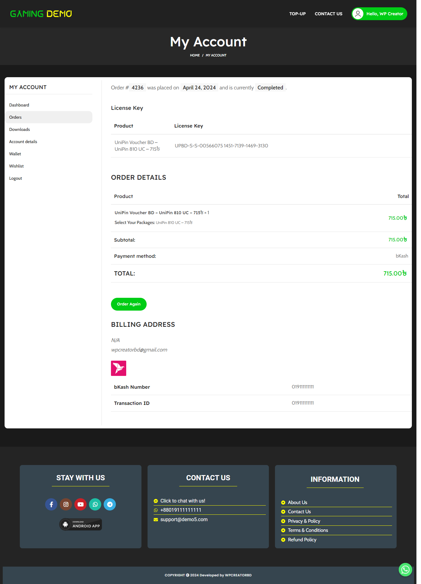 The best premade WordPress website backup file/code to make virtual visa cards, gift cards, and gaming topup, software licenses websites. Your user can buy items from this site and you will get an email after placing the order. And your user also gets an email if his order is approved.